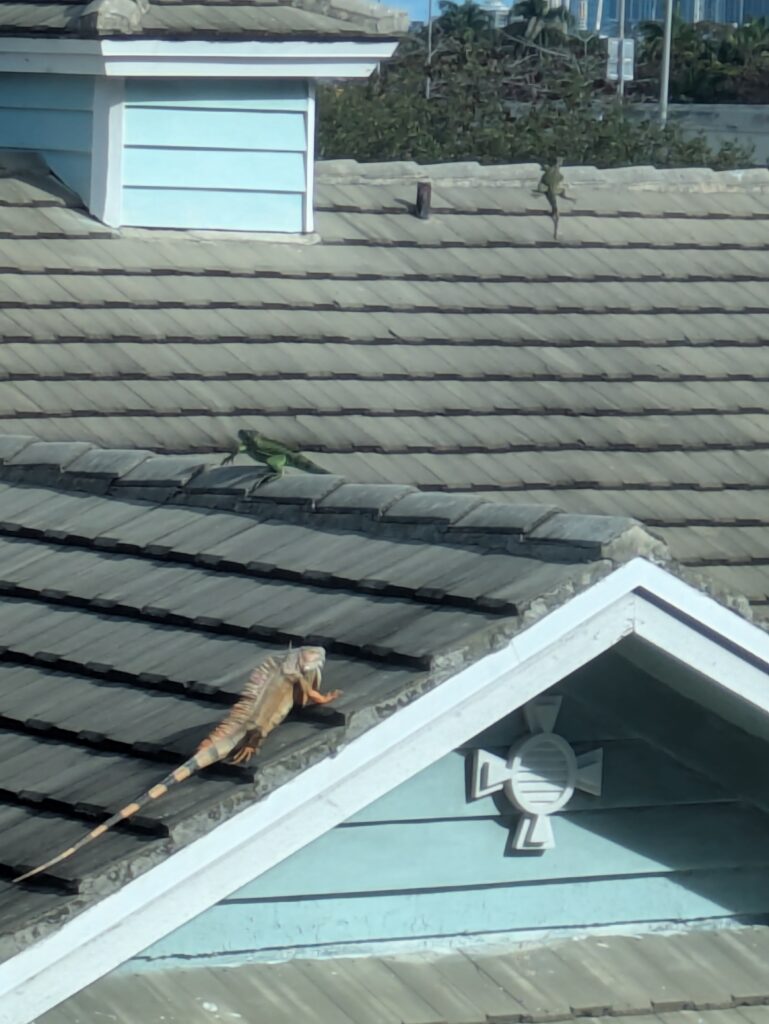 We fly into Fort Lauderdale a day early. We spend the night at the Maritme Hotel Fort Lauderdale Airport and Cruiseport (2161 Maritime Mile Blvd). Good midpoint location between the Airport and Cruiseport. Free airport shuttle, pricey port shuttle. We used Uber to the Cruiseport for less than half the cost the Hotel offered (Hotel $20 per person/ Uber $25 including tip / there were 3 of us). View from our room! There were at least 8 iguanas on the roof, but this is my best photo. Welcome to Florida!
